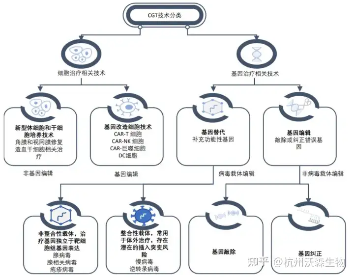目前业界通常将基因和细胞疗法归为一类,统称为Gene & Cell Therapy,简称CGT。基因治疗通过递送功能基因或编辑缺陷基因,根治遗传病、癌症等疾病,例如CRISPR基因编辑技术、AAV病毒载体疗法。细胞治疗利用改造后的免疫细胞(如CAR-T)或干细胞,实现精准杀伤肿瘤或组织再生。