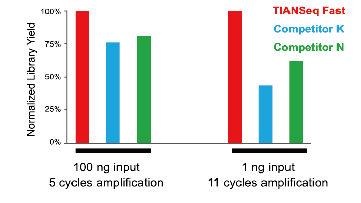 TIANSeq Fast DNA Library Kit(Illumina) 是专门针对于Illumina 高通量测序平台所优化的 DNA 文库构建试剂盒。本产品可将经超声处理、化学处理、酶处理的片段化双链 DNA 或小片段 DNA 的末端修复和 3’端 dA 尾添加在一管内一步法完成,同时所得产物无需纯化,可直接用于adapter 的连接。另外,本试剂盒配备的 PCR 扩增试剂经过专门的优化,扩增所得 DNA 序列产量高,保真度好、无碱基偏好性。本产品采用一步法的反应流程,省去了多步纯化步骤,整个文库构建流程仅需2 hr;文库转化效率更高,可对微量 DNA 样本进行高效的文库构建。