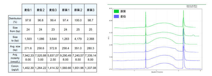 取100ng gDNA分别装于原装520045和M7042打断管中,用相同的参数进行打断,然后用Qsep400进行片段质检,从质检图可以看出麦伯的打断管和原装打断管在打断数据以及片段分布差异不大,可进行替换。