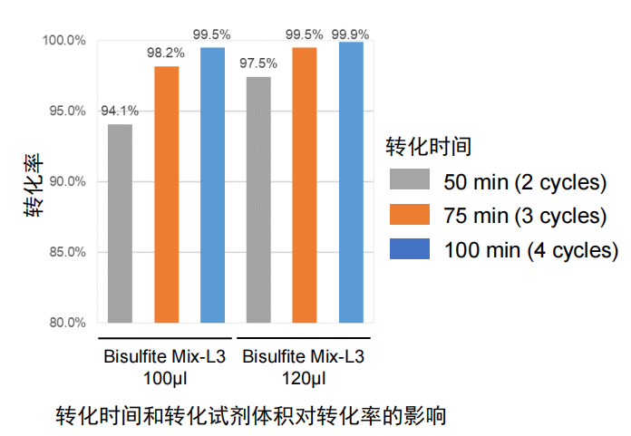 用天根DNA重亚硫酸盐快速转化试剂盒DP225转化1 μg Human Genome DNA+10 ng λ DNA,比较了不同转化试剂体积(100 μl和120 μl)和不同转化时间(50 min (2 cycles), 75 min (3 cycles)和100 min (4 cycles))对转化率的影响,转化率通过NGS方法评估(流程见上表)。结果显示,转化试剂体积为120 μl时,相比100 μl得到更高的转化率;转化时间为100 min (4 cycles)时 ,相比于更短的转化时间(50 min (2 cycles)和75 min (3 cycles)),得到更高的转化率。